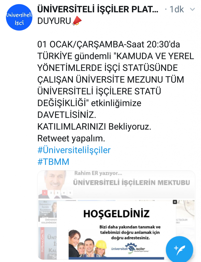 Kamu Kurum, Kuruluşlarında, Belediyelerde ve KİT’lerde 4857 sayılı iş kanununa göre daimi işçi statüsünde çalışan ve statü değişikliği isteyen üniversite mezunu (Ön Lisans, Lisans ve Yüksek Lisans ) üniversiteli işçiler platformu, statü değişikliği taleplerini dile getirmek için 01 Ocak 2020 Çarşamba Günü-Saat 20:30’da gerçekleştirecekleri Twitter etkinliğinin duyurusunu yaptılar.